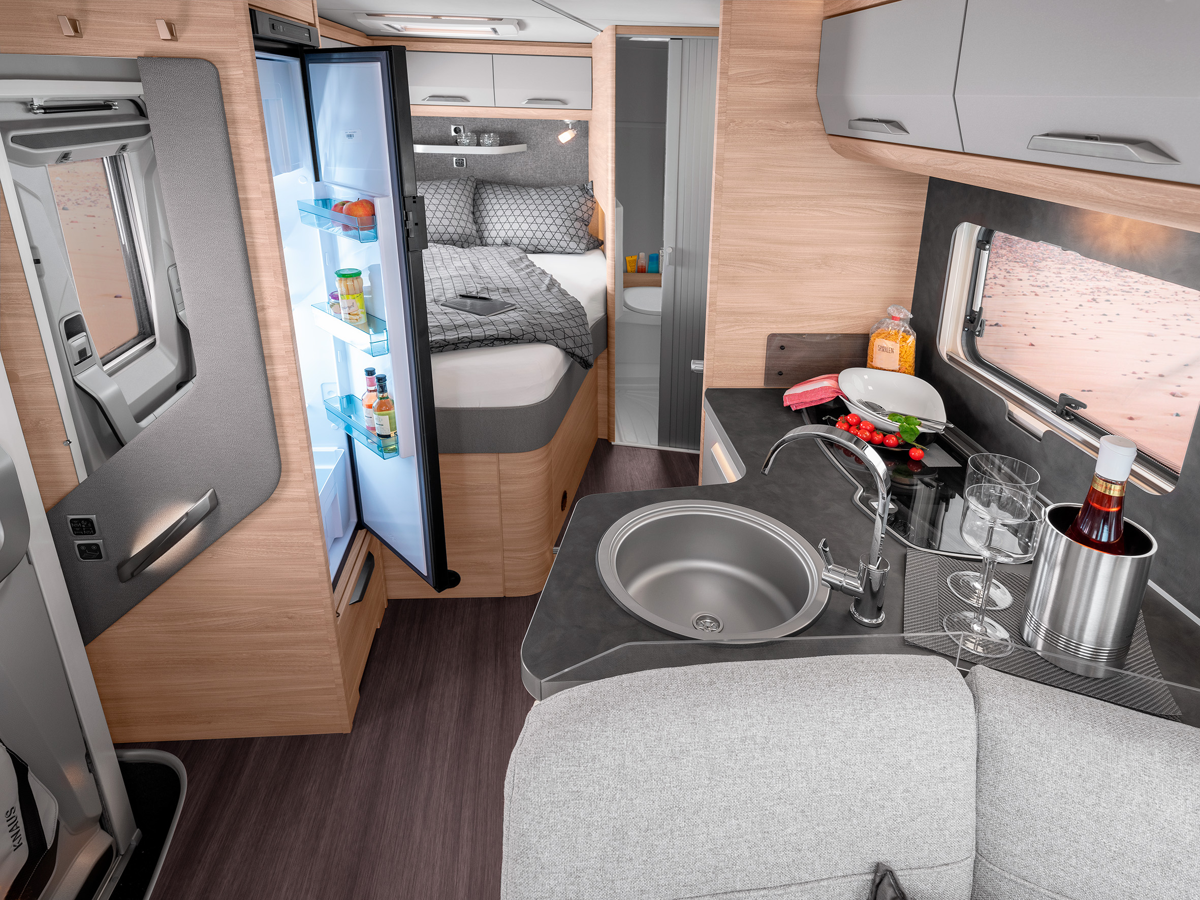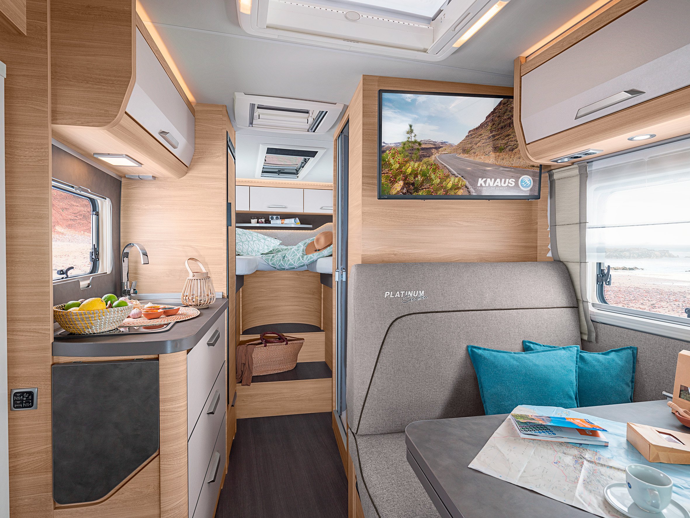 Sisällä Knaus Van Ti Plus -autossa on kokkia ilahduttava tilava keittiö, jossa on suuri jääkaappi, tilavat ja tukevat laatikot sekä paljon säilytyslokeroita. Iltaisin tunnelmavalaistus luo kotoisan ilmapiirin olo‐ ja makuuhuoneseen!