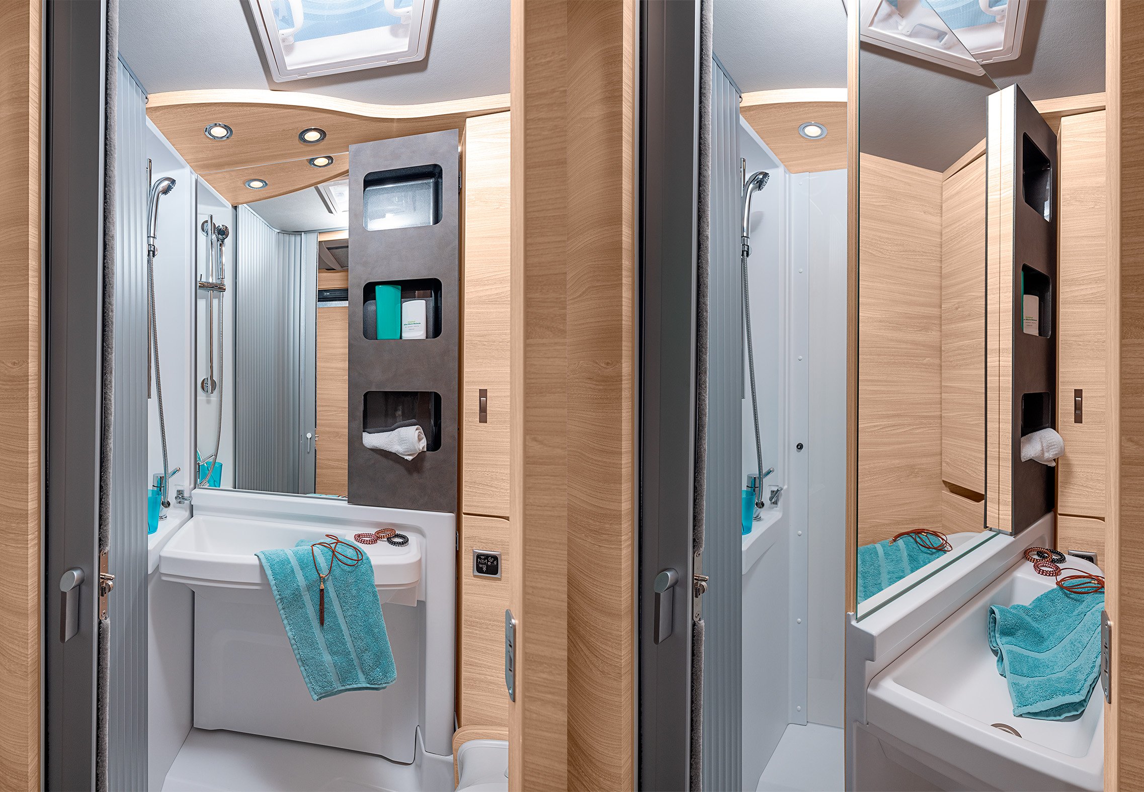 Knaus Van Ti Plus 650 MEG Platinum Selection -matkailuauton kylpyhuoneessa on tyylikäs valaistus ja laadukkaat kalusteet. Erityinen yksityiskohta on käännettävä seinä, jonka takaa avautuu tilava suihkukaappi. Magneettilukon ansiosta suihkun ovi voidaan sulkea vesitiiviisti.