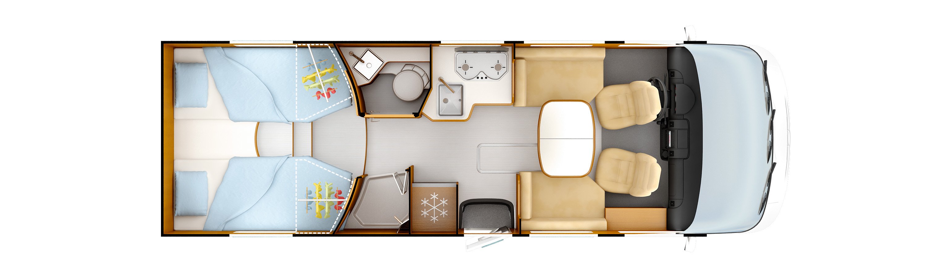 Makuupaikkoja löytyy vakiona neljälle, mutta lisävarusteena on mahdollisuus valita sähkökäyttöinen laskuvuode takaosaan, jolloin makuupaikkoja on jopa kuudelle.