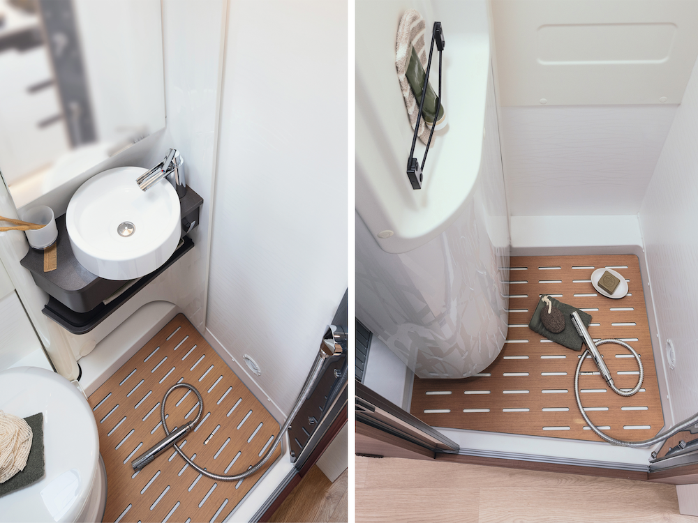 Rapido V68 retkeilyautossa on nerokas DUO'SPACE -suihkutila. TIlassa on kääntyvä seinä, jolla WC-tilan saa piiloon ja samalla suihkuun saa lisää tilaa. Nerokasta tilankäyttöä, eikö vain?