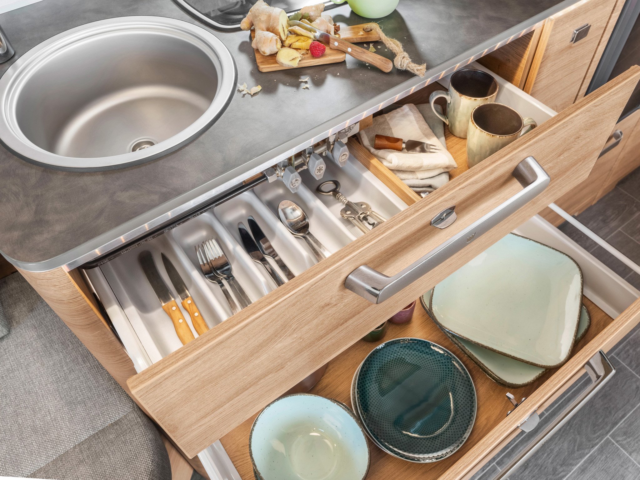 Tabbert Da Vinci hurmaa viimeistellyillä yksityiskohdillaan – laadukkaat kalusteet, käytännölliset keittiöratkaisut ja tyylikkäät materiaalivalinnat tekevät arjesta matkalla yhtä nautinnollista kuin kotona.