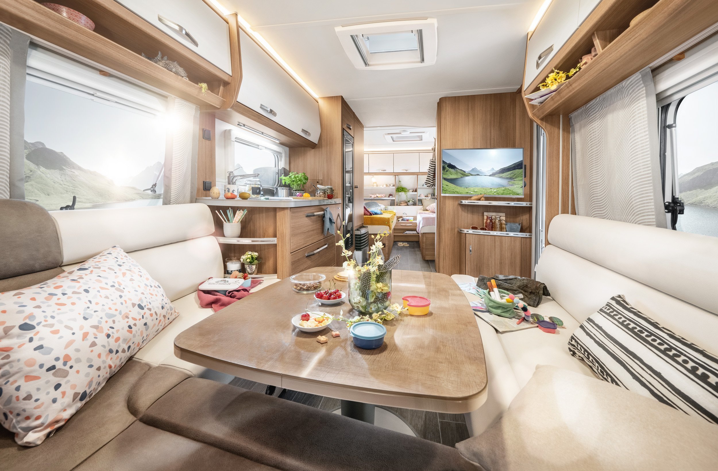 Tabbert Rossini -matkailuvaunu luo kodikkaan ja miellyttävän ympäristön, jossa yhdessäolo on helppoa ja rentouttavaa. Hyvin suunniteltu pöytäryhmä, pehmeät materiaalit ja harmoninen sisustus tekevät jokaisesta hetkestä matkalla viihtyisän ja rennon.