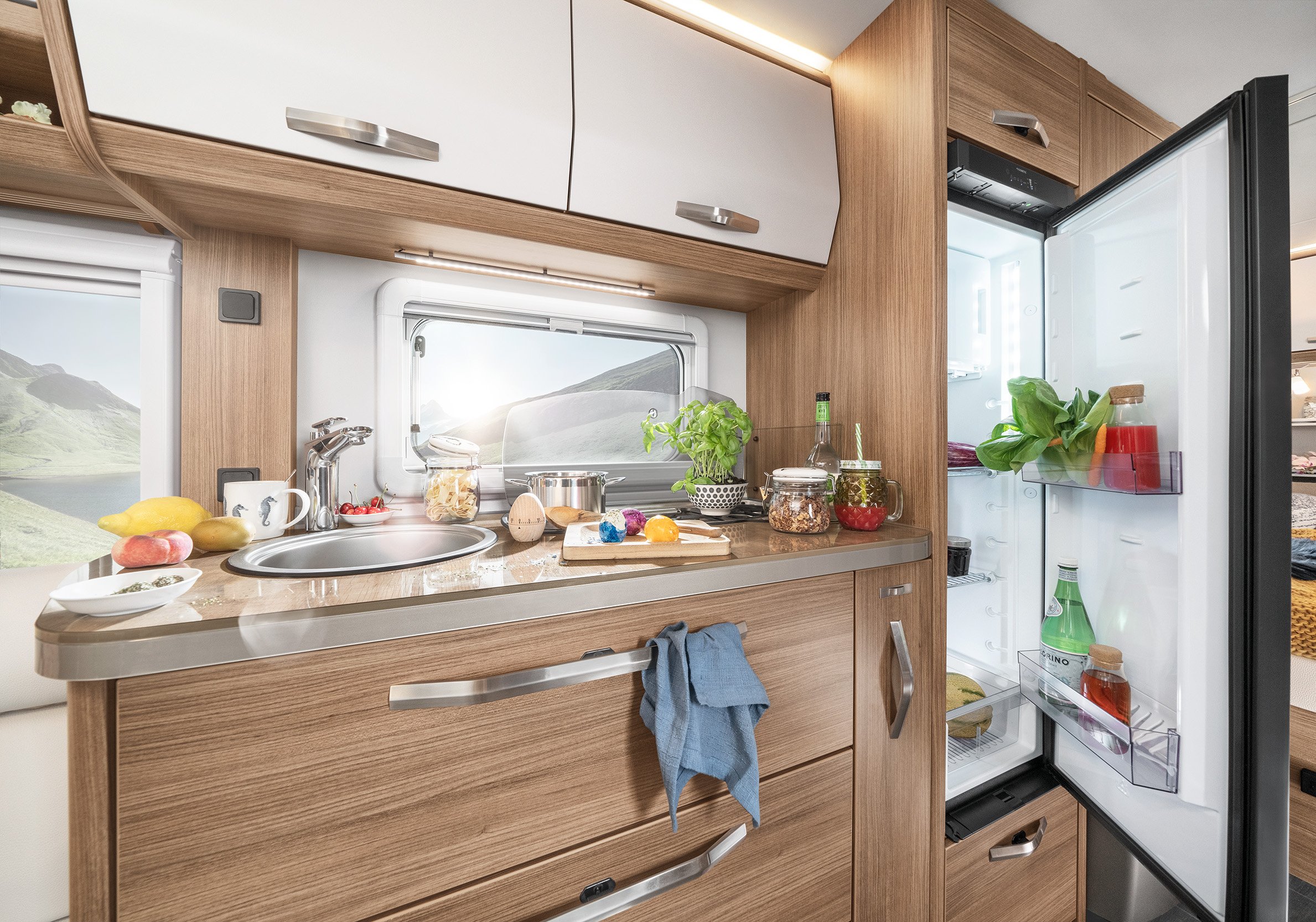 Tabbert Rossini -matkailuvaunun keittiössä yhdistyvät käytännöllisyys ja tyylikkyys. Toimivat ratkaisut, laadukkaat materiaalit ja moderni varustelu tekevät ruoanlaitosta matkalla helppoa ja mukavaa – aivan kuin kotona.