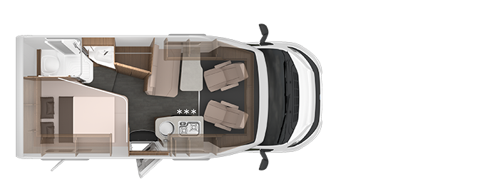 VAN TI VANSATION 550 MF on kahden hengen ihanteellinen matkakumppani. Vaikka ajoneuvon pituus on alle 6 m, mahtuu sisälle 140cm leveä ja 200cm pitkä ranskalainen vuode.