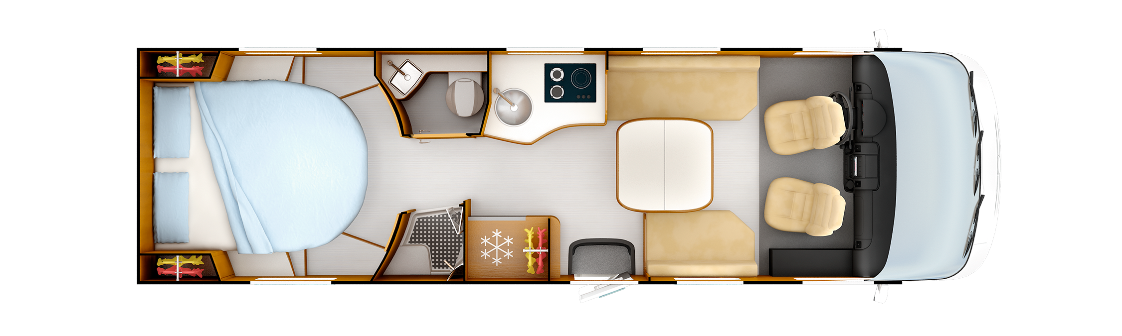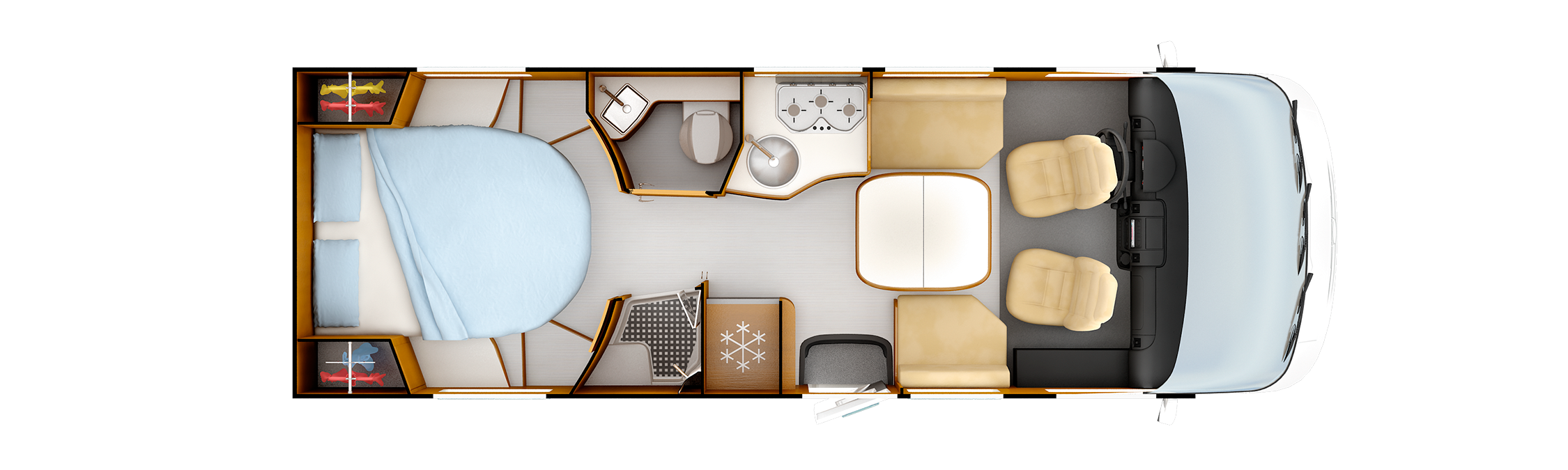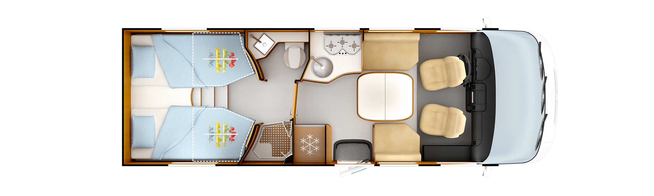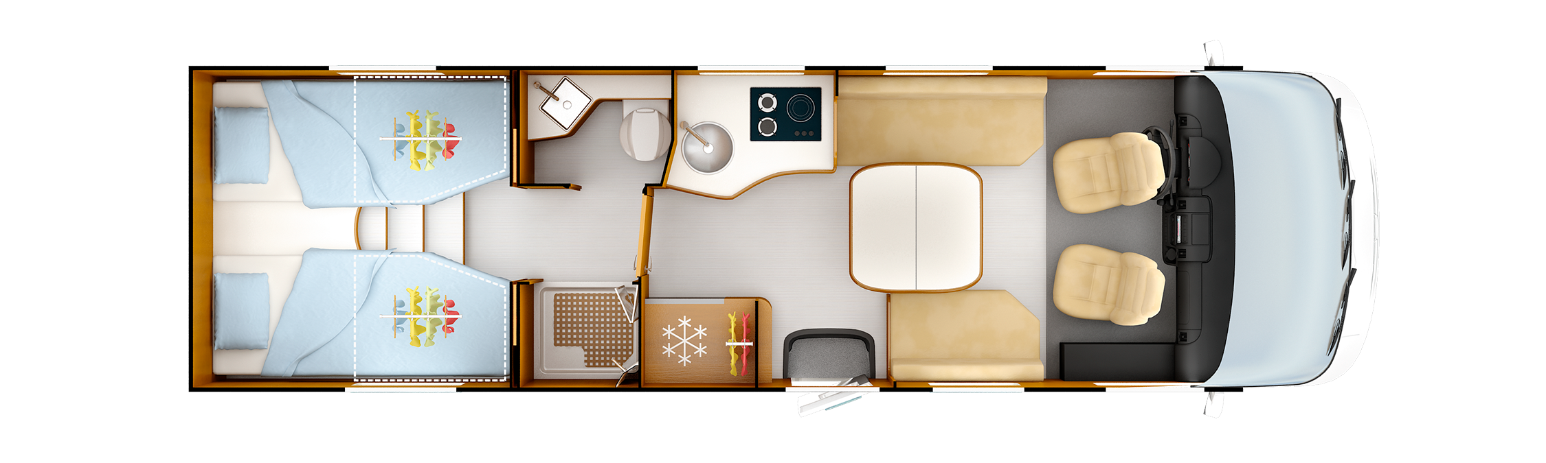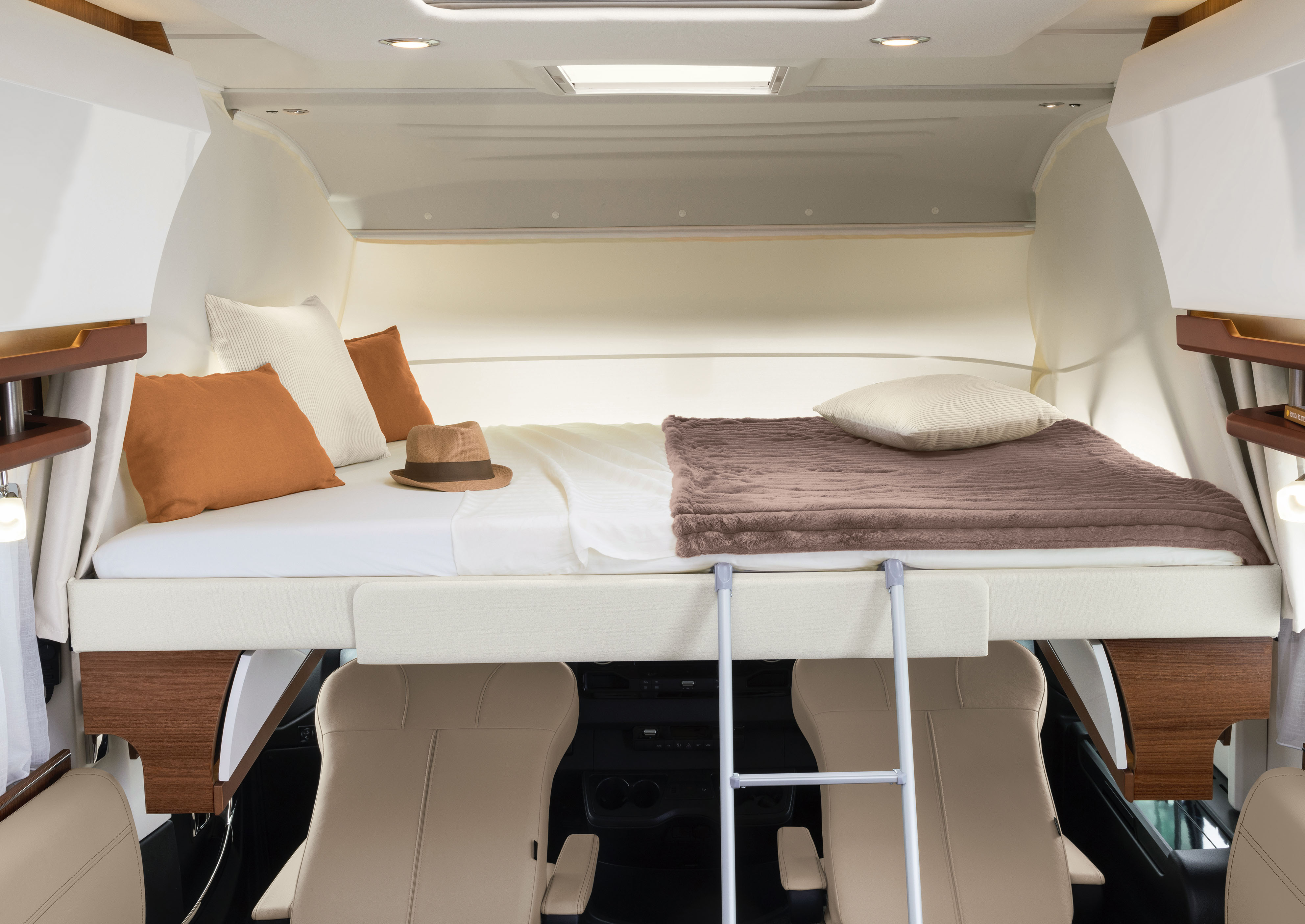Distincion -sarjan malleissa on vakiovarusteena ohjaamon päälle laskettava ylävuode, jonka ansiosta jokaisessa pohjaratkaisussa on makuupaikat neljälle henkilölle.